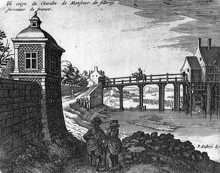 'Un coign du chardin de Monsieur de Sillerey secrétaire de France'. Vue du pavillon carré construit par Le Vau vers 1646 et du pont qui relie le moulin de Quinquengrogne pris d'aval.