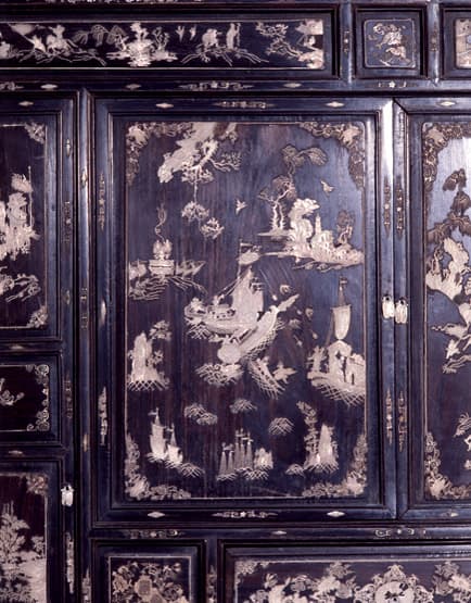 Détail du panneau de gauche orné de motifs de paysage et de bateau.