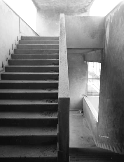 L'escalier d'accès à la tribune pris en direction du gymnase.