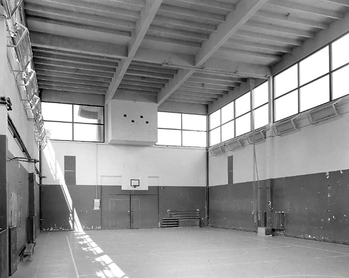 Vue intérieure du gymnase. Au-dessus de la porte, la cabine technique.