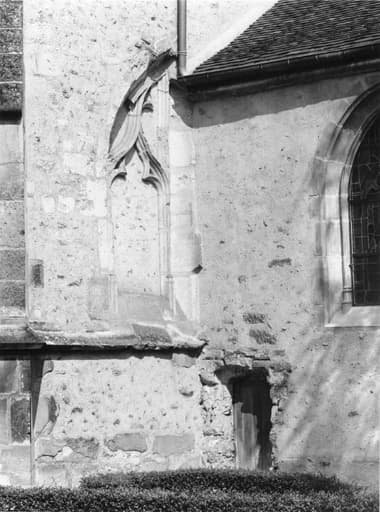 Vue de la fenêtre est du transept sud partiellement démolie lors de la construction de la chapelle Sainte-Geneviève (actuellement sacristie).