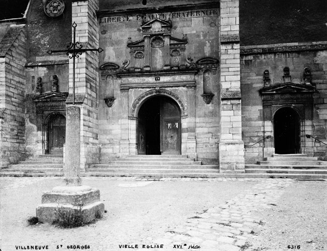 Au premier plan, la croix de cimetière. A l'arrière plan, détail des trois portails.