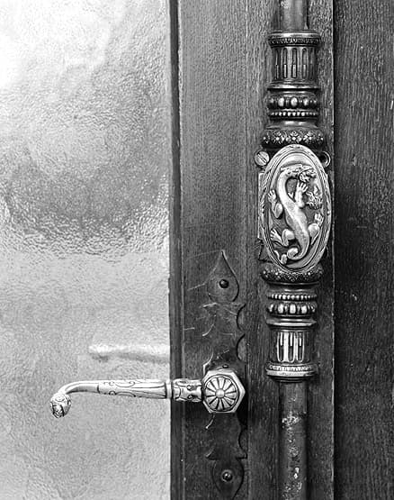 Détail d'une espagnolette et d'une poignée de porte-fenêtre.