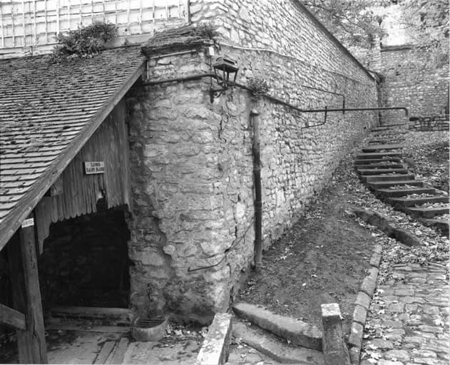 Vue de situation de la fontaine. On peut voir les tuyaux qui, de la fontaine située sous le toit, permettaient le remplissage des réserves stationnées sur le chemin.
