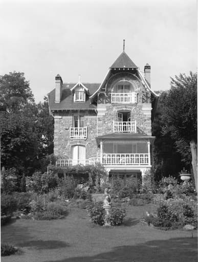 Vue de la façade sur jardin d'une maison de type anglo-normand construite en pierre meulière.