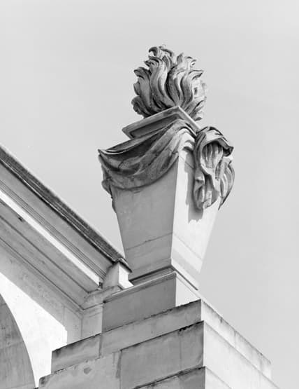 Détail d'un pot-à-feu en amortissement sur l'élévation antérieure.