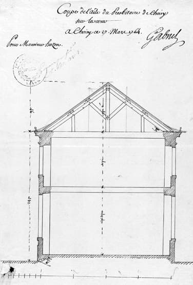 Coupe d'un bâtiment du presbytère couvert d'un toit à longs pans.