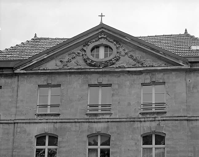 Le rendez-vous de chasse : détail du fronton ornant l'élévation antérieure.
