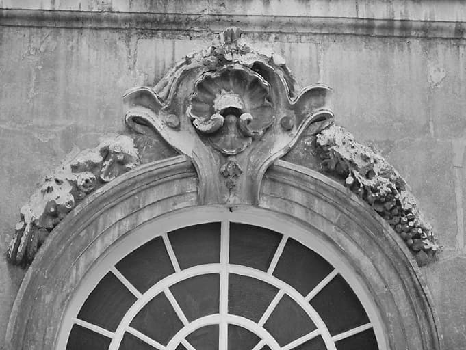Le rendez-vous de chasse : cartouche et guirlandes ornant certaines baies du rez-de-chaussée.