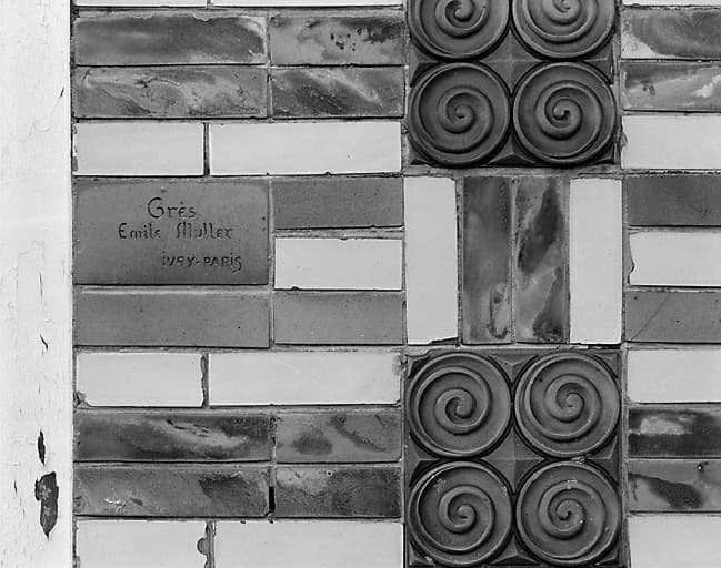 Détail des grès vernissés ornant la façade d'un laboratoire.