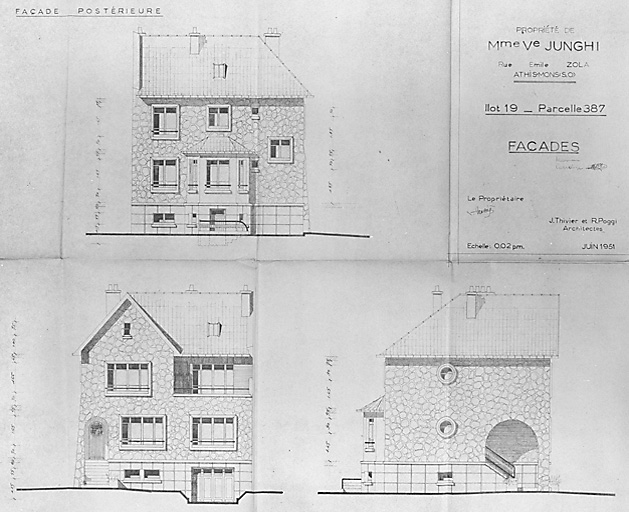 Plan dressé par les architectes Thivier et Poggi pour la maison de Mme Junghi, 16, rue Emile-Zola : élévations, juin 1951.