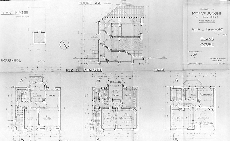 Plan dressé par les architectes Thivier et Poggi pour la maison de Mme Junghi, 16, rue Emile-Zola : élévations, juin 1951.