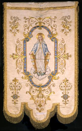 Bannière de procession, ornée d'une Immaculée Conception. Au revers, la bannière porte l'inscription : 'Enfants de Marie. N.-D. de Melun'.