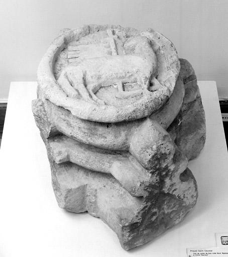 Clé de voûte sculptée : Agneau de Dieu (13e siècle), provenant du collatéral nord de l'église (ou Chapelle des Coches, détruite en 1869). Musée de Melun, inv. 967.352.