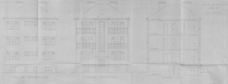 Coupe et élévations de la maison à deux logements (?) construite sur la parcelle 323 de l'îlot 17 pour les héritiers Ganet (82, avenue Jean-Jaurès) ; Jacques Chauliat architecte d'études en collaboration avec E. et J. P. Chauliat ; Thivier et Poggi architectes d'opération. Il s'agit du plan définitif à deux étages.