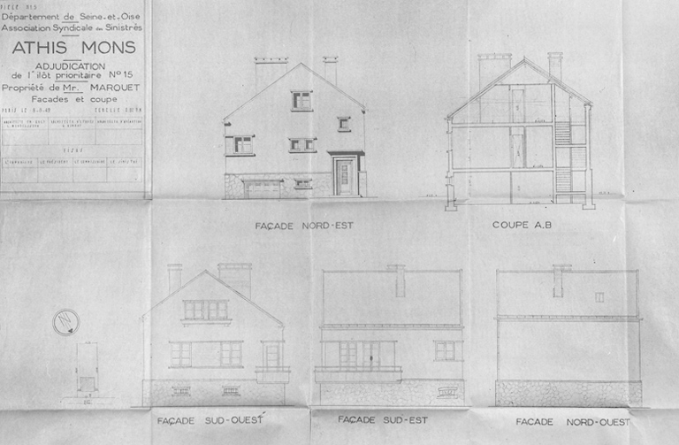 Elévations et coupe de la maison reconstruite dans l'îlot 15 pour M. Marquet (11, rue Gabriel-Péri) ; architecte en chef Léo Mendelssohn, G. Dumont, architecte d'études, 8 août 1949.