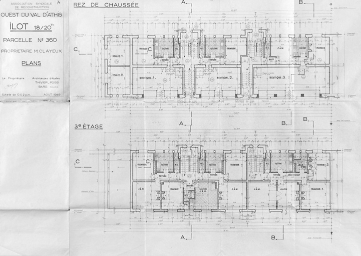 Plans du rez-de-chaussée et du 3e étage de l'immeuble Clayeux (mitoyen avec l'immeuble Dervaux), 2-4bis, place Jean-Jaurès ; Thivier, Poggi et Bard, architectes d'études ; 9 août 1949.