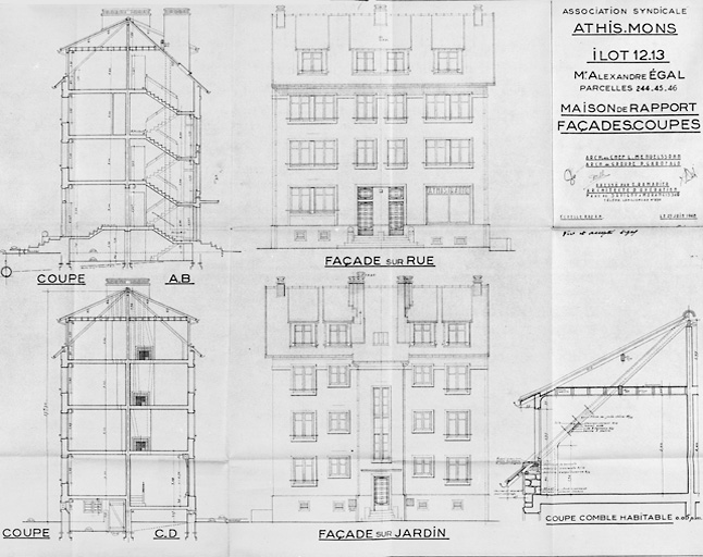 Coupe et élévations de l'immeuble avec boutique reconstruit dans l'îlot 13, au 67, rue de Juvisy (parcelles 244-246) pour M. Alexandre Egal ; P. Garofalo architecte chef de groupe, E. Ramadier, architecte d'opération ; 25 juin 1948.