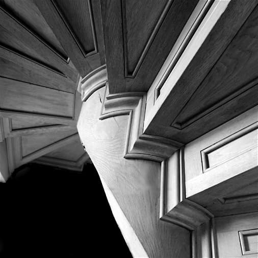 Vue en contre-plongée des marches du même escalier.