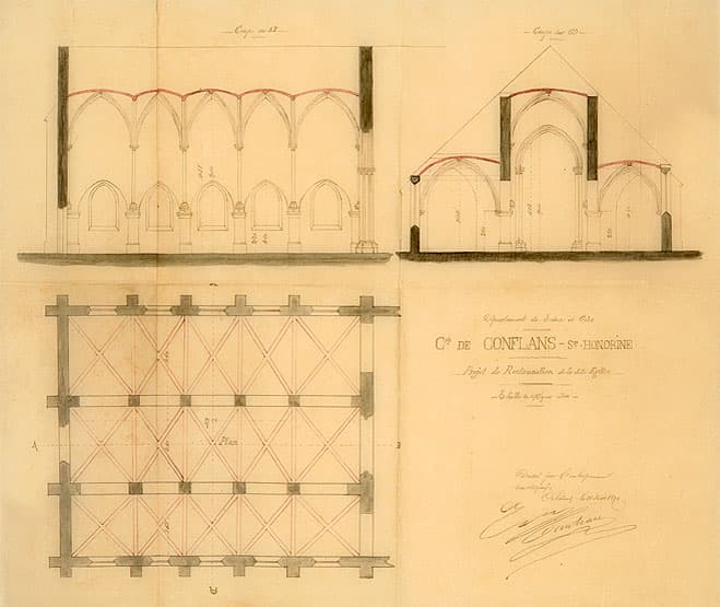 Projet de restauration de 1870 : plan, coupes longitudinale et transversale.