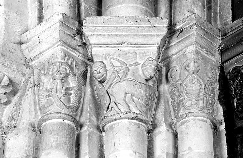 Pile nord est: groupe de 3 chapiteaux : dragons affrontés se mordant la queue, archer ou centaure visant un félin, palmettes et entrelacs.
