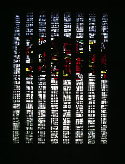 Détail de la verrière de gauche (en regardant l'autel), consacrée aux mystères douloureux du rosaire : une lance et un coq rappelant l'Arrestation du Christ et le Couronnement d'épines.