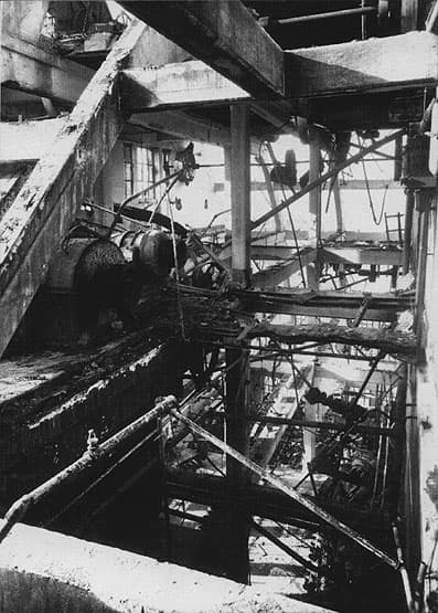 Les Grands Moulins de Pantin après l'incendie du 19 juin 1944. Nettoyage, 7e étage, vue prise de la porte sur tour. Au deuxième plan, le ventilateur du sécheur et son moteur.