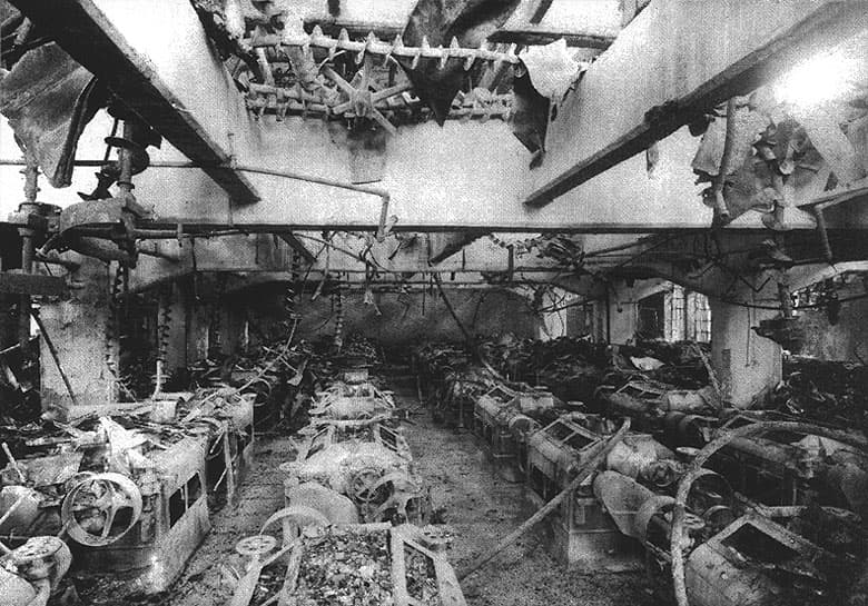 Les Grands Moulins de Pantin après l'incendie du 19 juin 1944. Moulin, 1er étage, vue de la salle des cylindres prise du pignon côté rue.