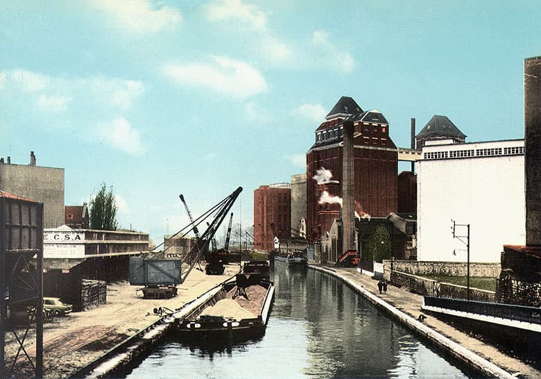 A l'inflexion du canal de l'Ourcq, les Grands Moulins de Pantin et la blanchisserie Elis flanquée de sa cheminée. A gauche du silo à blé 'canal', la semoulerie, élevée en 1952. A droite, se distinguant par sa façade de béton uni (rehaussé de blanc sur le document), le silo 'Danton', élevé en 1961. Sans date, années 1960-1970.