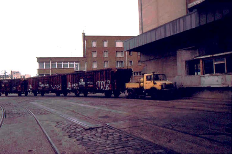 Les wagons vides sont acheminés vers le quai de chargement, le long du magasin à farine. Au fond, le bâtiment de l'administration (construit en 1956 sur les plans de Léon Bailly), surmonté de deux étages de logements (1959-1960, Léon Bailly), à droite, les silos à farines, ou 'extension silos' (1980, François Mathieu) accolés au magasin à farine.