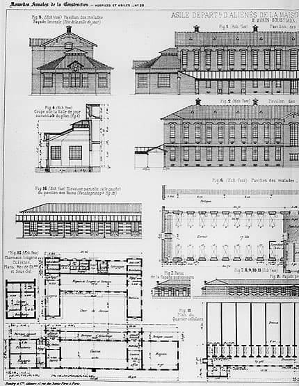 Elévations, coupes et plans des bâtiments de l'asile : pavillon des malades, pavillon des bains, services généraux (partie gauche), par l'architecte Morin-Goustiaux