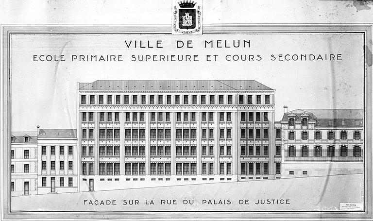 Projet de Félix Boutron, lauréat du concours organisé par la Ville de Melun pour la construction d'un groupe scolaire sur le site du théâtre, au 37-39 rue du Général de Gaulle (emplacement abandonné en 1931). Façade sur la rue du Palais de Justice (actuelle rue du Général-de-Gaulle).