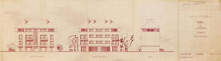 Premier projet de Louis Arretche pour le secteur 'route de Corbeil' : façades d'un immeuble HLM de type 3.2, à 3 étages.