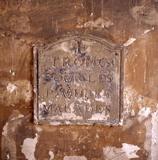 Plaque dans le cloître : 'tronc pour les pauvres malades'.