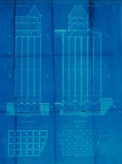 Grands Moulins de Pantin-Paris, projet de silos à blé. Plans et coupes des quatre premières travées. Etablissements Ed. Zublin et Cie.