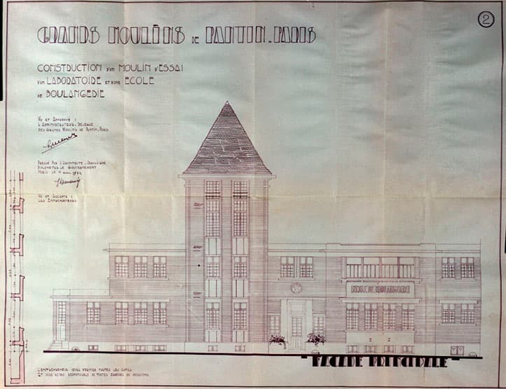 Grands Moulins de Pantin-Paris, Construction d'un moulin d'essai, d'un laboratoire et d'une école de boulangerie, façade principale. Signature illisible. Le toit du corps central n'a pas été réalisé.