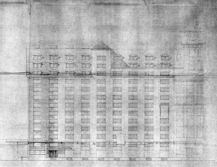 Grands Moulins de Pantin-Paris, projet de silos à blé (il s'agit du nouveau magasin à farine, construit après l'incendie du 19 août 1944). Signé et daté en haut à gauche : L. Bailly, architecte S.A.D.G., Paris, le 25 juin 1945 (modifié le 9 octobre 1945). Partie droite de la feuille : façade ouest.