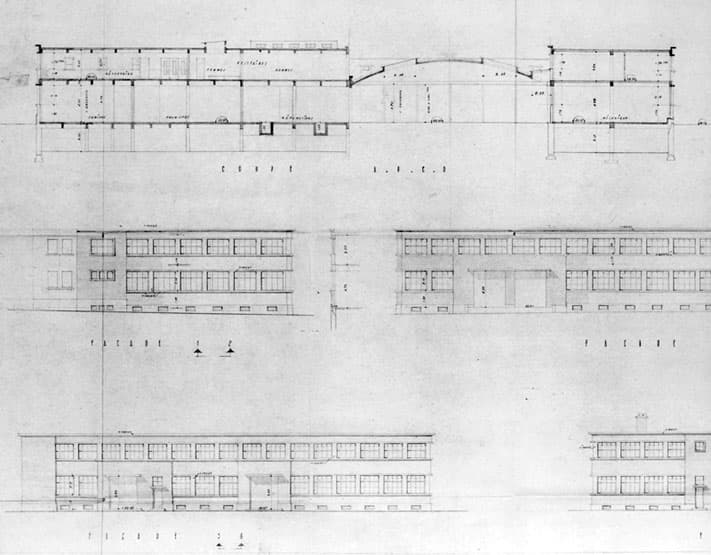 Grands Moulins de Strasbourg, garages, ateliers, service sociaux, façades, coupe. Dressé par L. Bailly arc. S.A.D.G, Paris oct. 1949, vu et accepté le 22 nov. 1949. Partie gauche de la feuille.