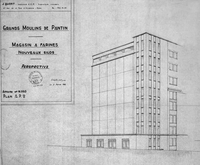 Grands Moulins de Pantin, magasin à farines (emplacement erroné), nouveaux silos, perspective (il s'agit des nouveaux silos à farine 'canal' accolé au dos du bâtiment de nettoyage). En haut à gauche : 'J. Quost, Ingénieur E.C.P., Ingénieur conseil (...)' ; en bas à droite : 'le 9 février 1962'.