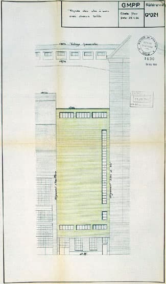 G.M.P.P., façade des silos à sons (ou à issues) avec chassis sabla. Daté en haut à droite : 25.4.66. Non signé (J. Quost). Silos achevés en 1969.