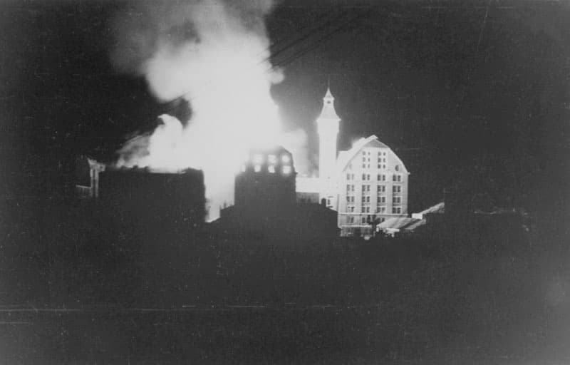 Incendie des Grands Moulins de Pantin, dans la nuit du 19 août 1944. Vue prise depuis la gare de marchandises. Le feu touche dans un premier temps le magasin à farine. Cliché anonyme, 1944.