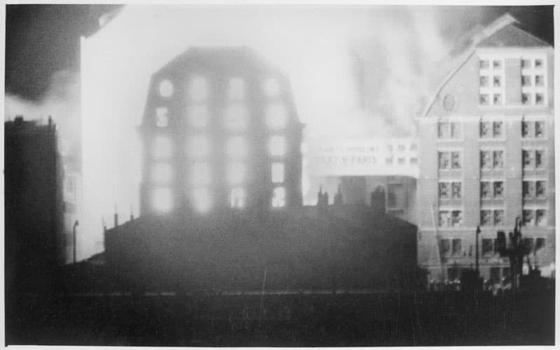 L'incendie des Grands Moulins de Pantin, dans la nuit du 19 août 1944. Détail du magasin à farine en flammes. Cliché anonyme, 1944.