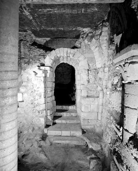 Crypte : couloir d'accès sud (vu vers l'ouest). A droite, le bouchage du collatéral