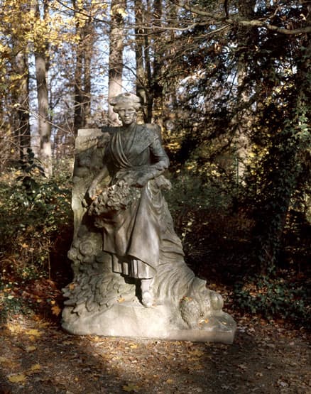 La sculpture représente une femme antillaise portant une corbeille de fruit.