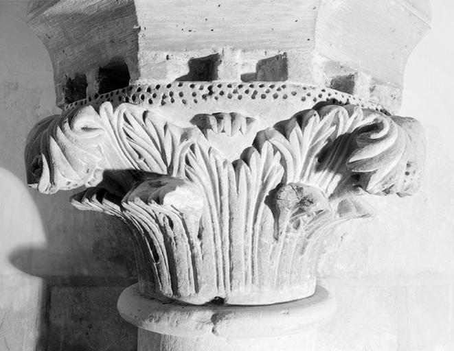 Chapiteau à feuille d'acanthe (vaisseau central de la nef, 1ere travée, côté sud), vu depuis un échafaudage en 2005.