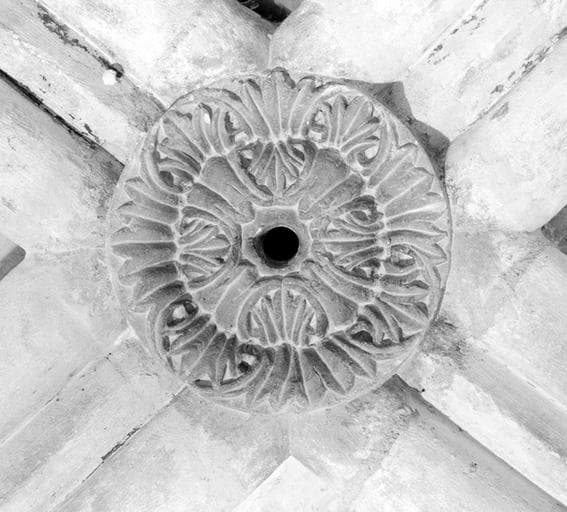 Clé de voûte de la nef, à décor végétal, vue depuis un échaffaudage en 2005.