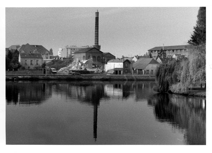 Vue d'ensemble, depuis le nord-est : le front de Seine. L'immeuble d'habitation à l 'est est en cours de démolition. 5 octobre 1997.