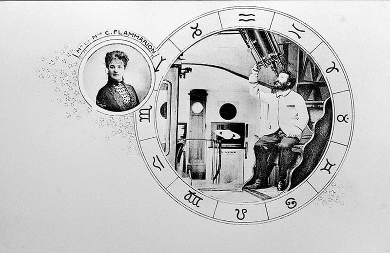 Portrait de Camille Flammarion et de son épouse illustrant une carte postale publicitaire en faveur de l'observatoire de Juvisy.