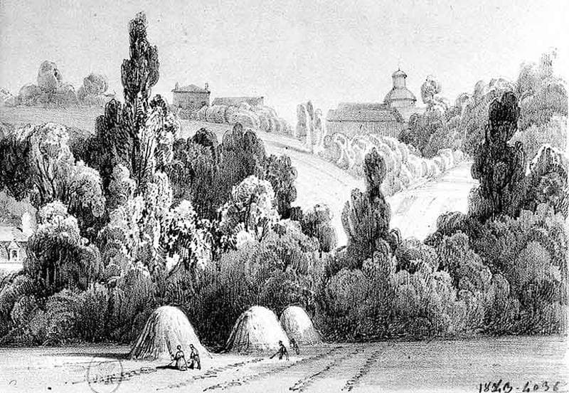 Lithographie non signée, sans doute de Charpin, représentant la ferme de Fromenteau en 1843, alors que le paysage de Juvisy et de la vallée de l'Orge était sur le point d'être profondément transformé par l'arrivée du chemin de fer.