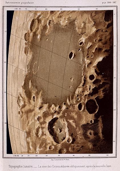 Planche hors-texte de l'ouvrage de Camille Flammarion intitulé : 'L'Astronomie populaire : description générale du ciel', publié par C. Marpon et E. Flammarion, en 1880 : illustration montrant la topographie lunaire, et plus particulièrement la mer des Crises, éclairée obliquement après la nouvelle lune.